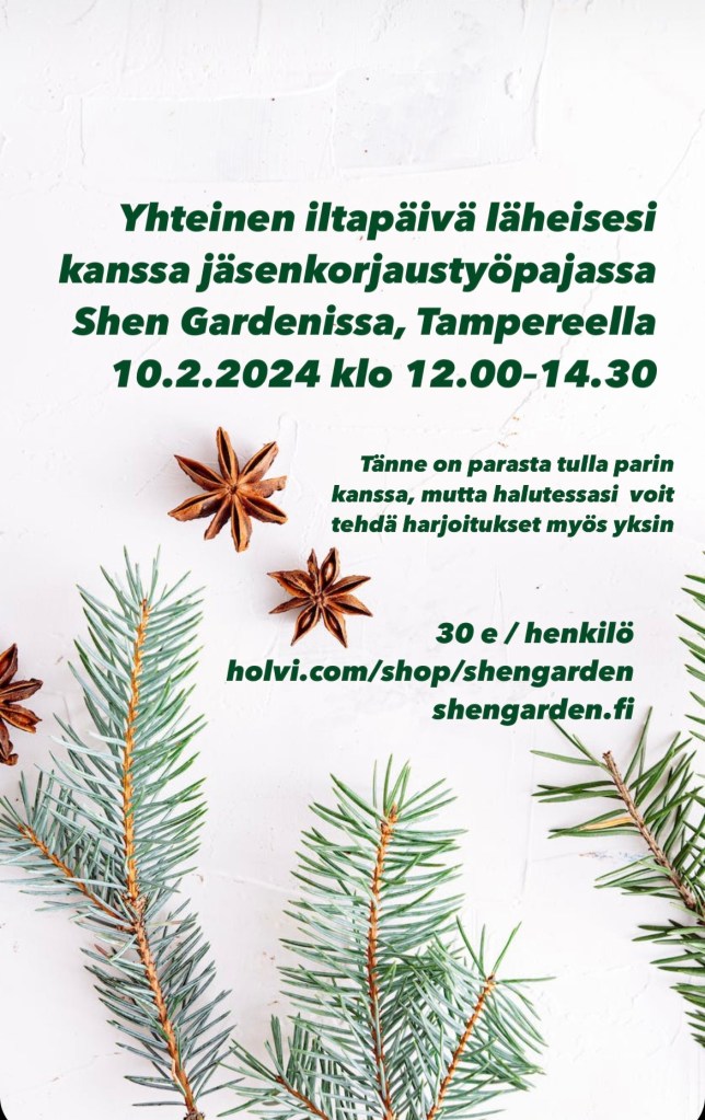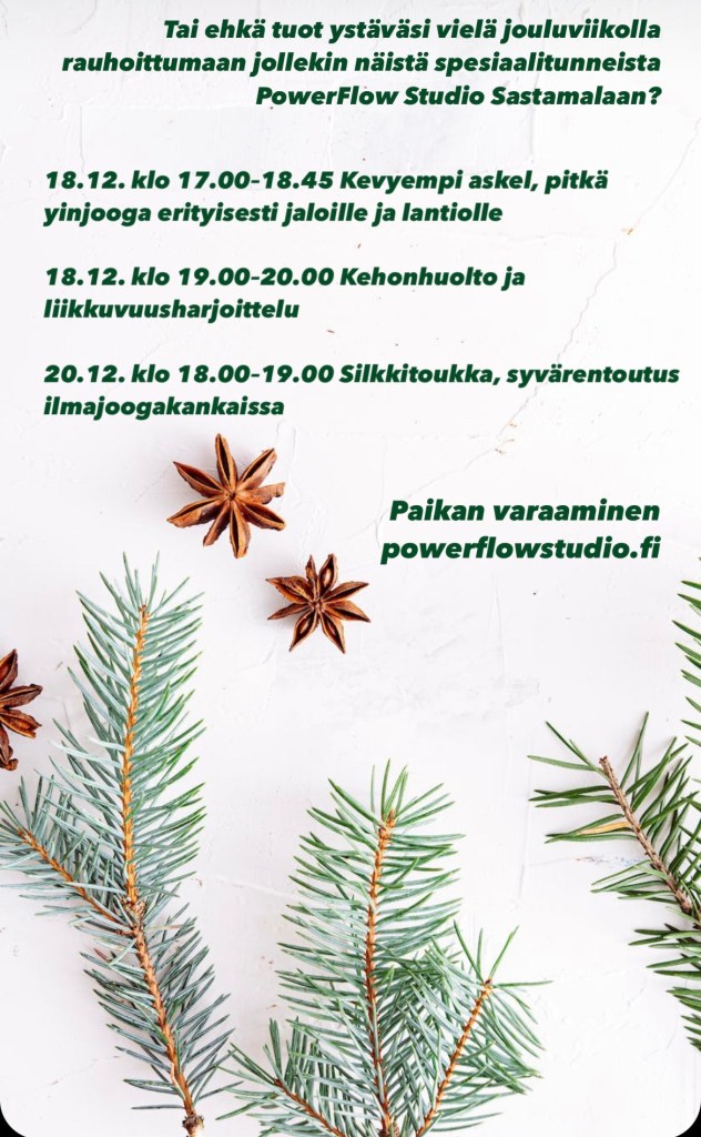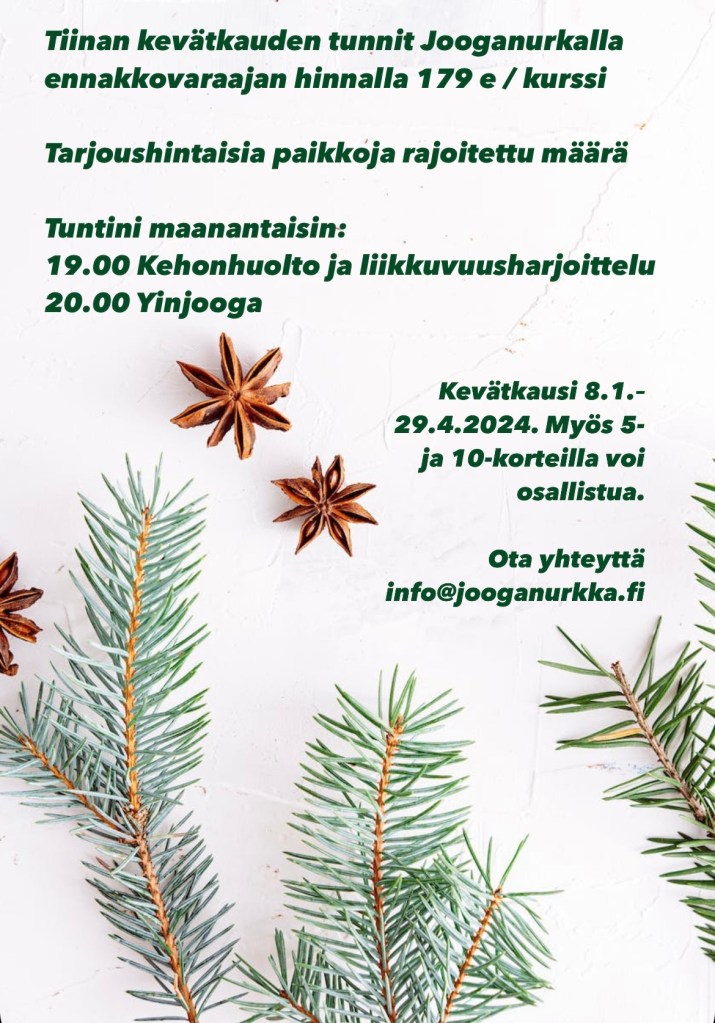 Yinjoogassa taas korostan, että joka asento näyttää joka ihmisellä hieman erilaiselta ja että on tärkeätä mennä asentoon rauhassa, tutkiskellen, kenties muutamaa eri vaihtoehtoa kokeillen ja ääriasentoja visusti välttäen. Tärkeätä on – mistä usein tunneillani puhun – myös kuunnella kehoaan vuorokausi tai pari harjoituksen jälkeen. Joskus vasta silloin selviää, oliko tunnilla esiintyneessä vihlaisussa kyseessä faskiajunttura vai nivelen hätähuuto.